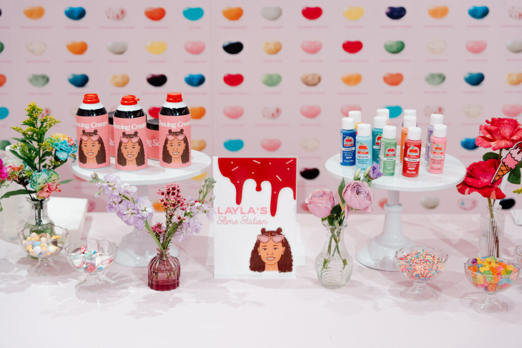 The venue already lended itself to tons of activities and lots of ice cream consumption… but we had to add a few fun stations for Layla and her friends, too! Among these activities were an adorable slime station (every kid’s favorite) and a charm bracelet cart!