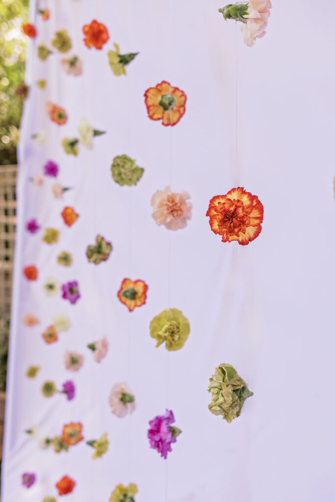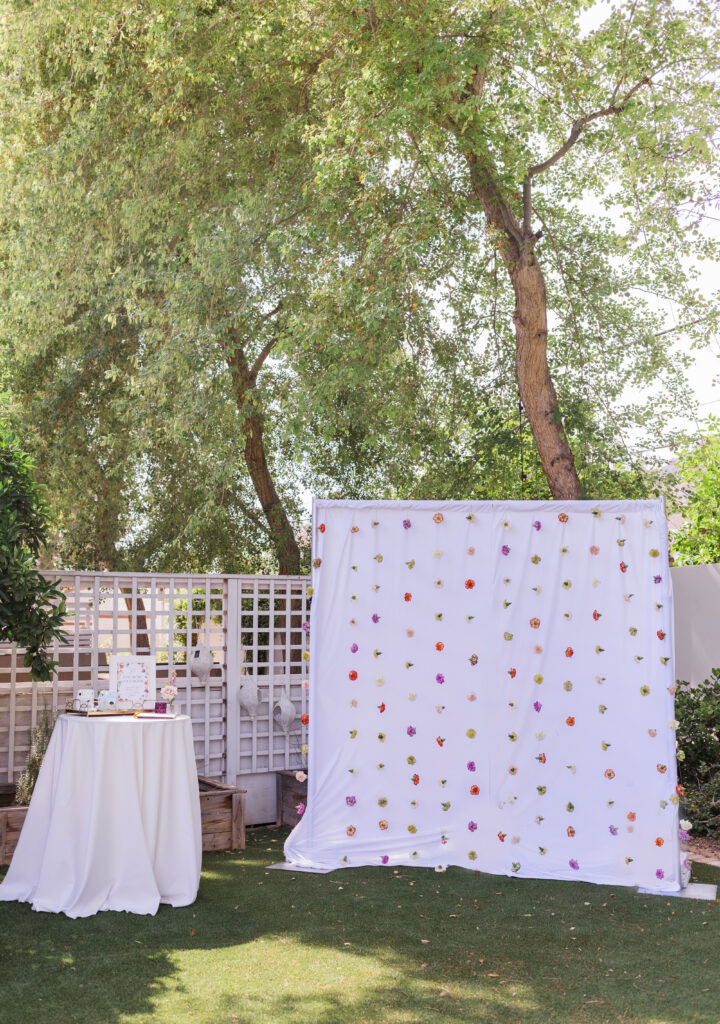 We had custom florals strung and hung in front of a white linen backdrop to create the most gorgeous and unique backdrop for Alexah and her friends to take photos for the polaroid guest book! It turned out so pretty!