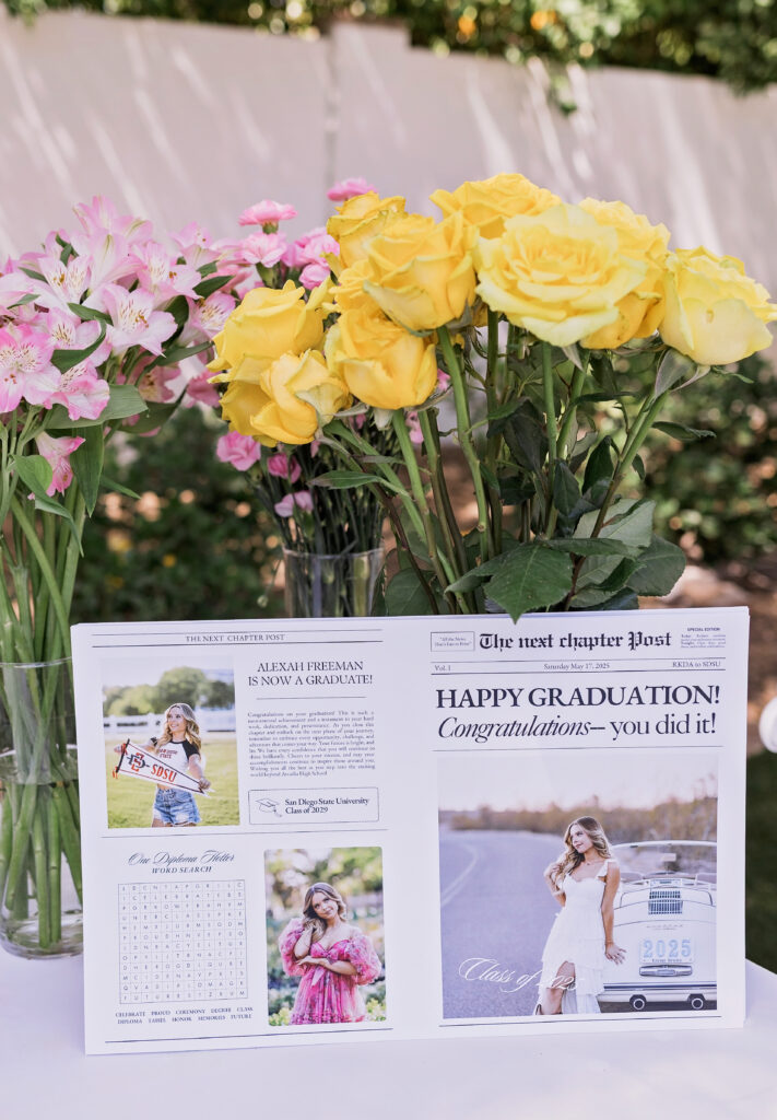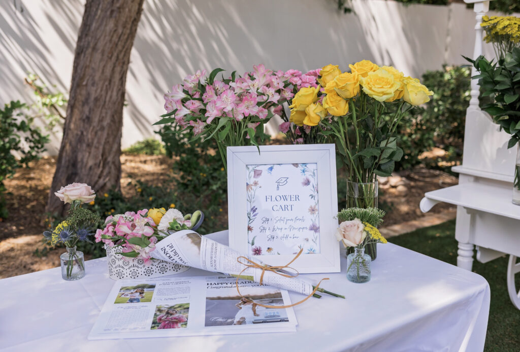 To create a fun activity for those in attendance, we incorporated a truly adorable floral cart where guests could make their own floral arrangements, wrap them in a custom newspaper celebrating Alexah and her achievements, and take them home as a favor! We cannot get over how cute and personalized these favors were.