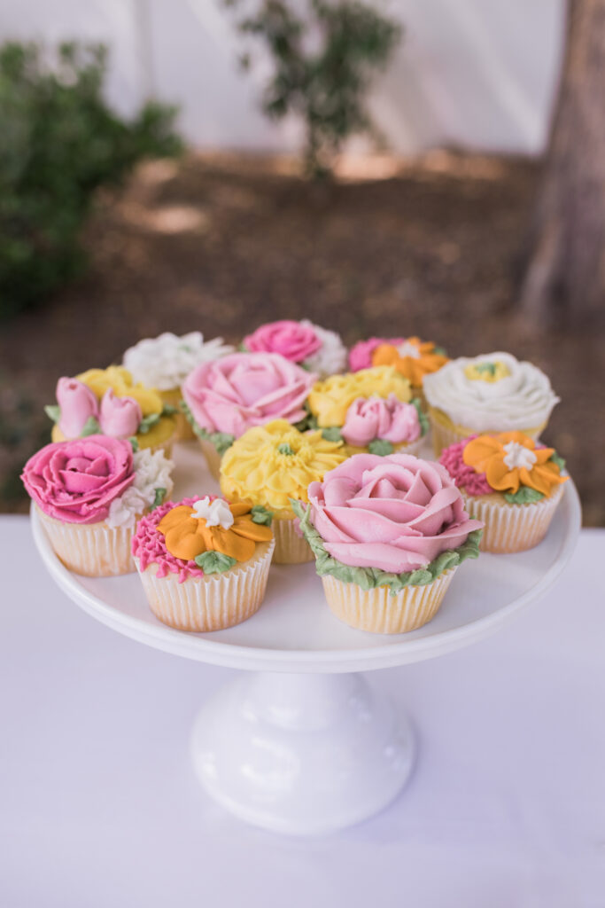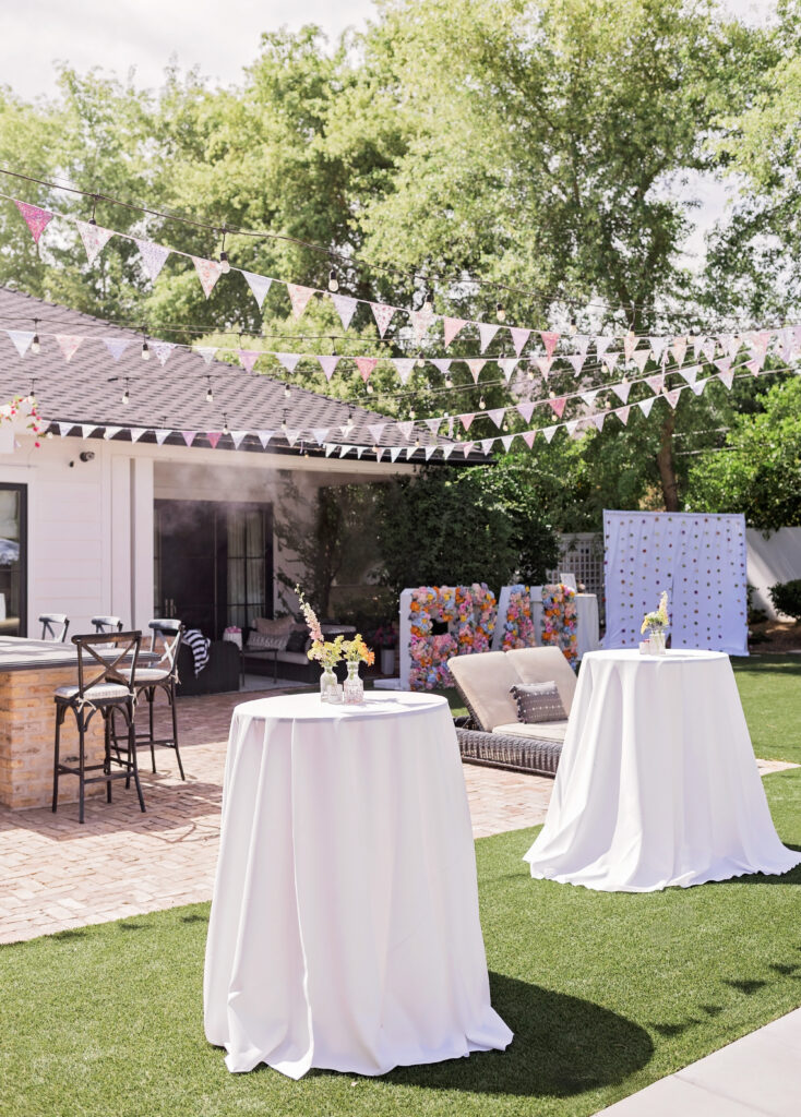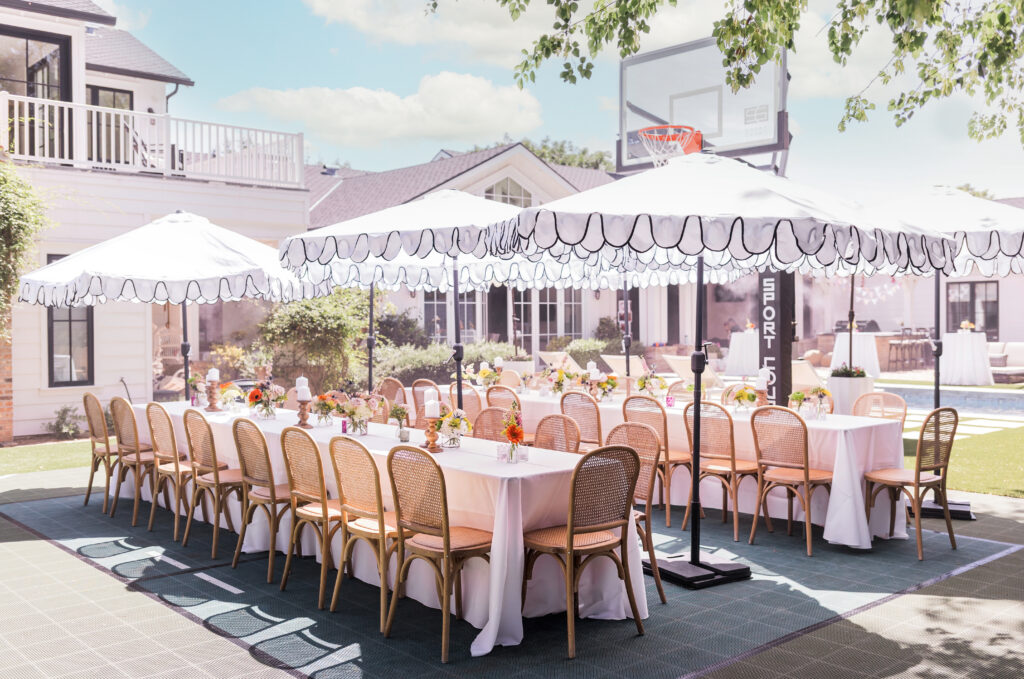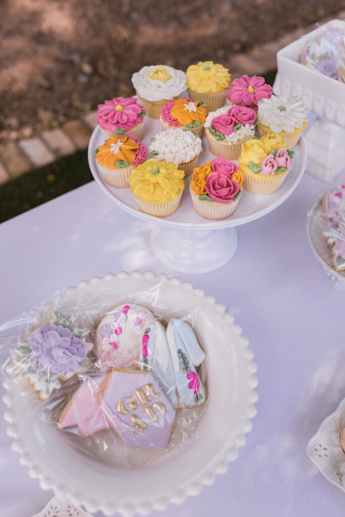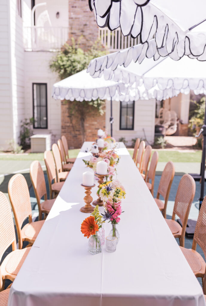 Out in her stunning backyard we incorporated seating at long rectangle tables with elevated rattan chairs and the most beautiful assorted florals! Wooden candle sticks and pastel colored votives were also scattered across the tables to add pops of color everywhere. Since it was getting hot here in the desert, we were sure to add in plenty of umbrellas to keep guests comfortable and cool – which we personally think added to the cute feminine theme!