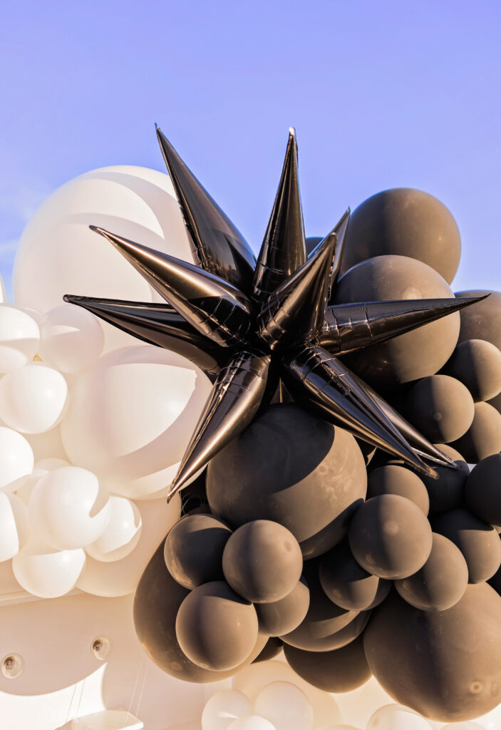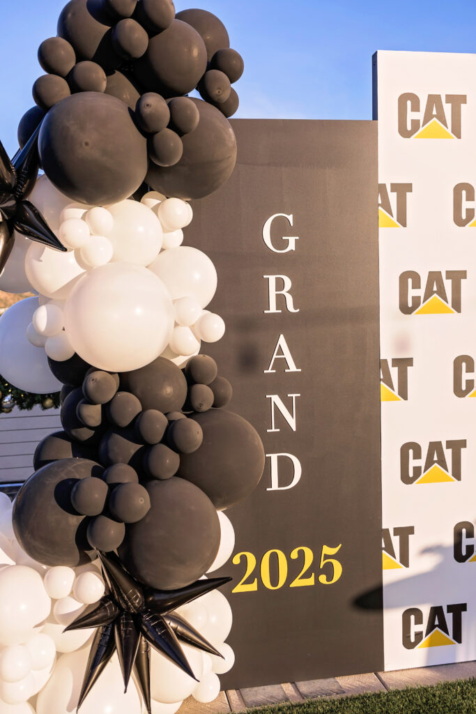 A custom Caterpillar step and repeat backdrop with black and white balloons was the perfect place to strike a pose!