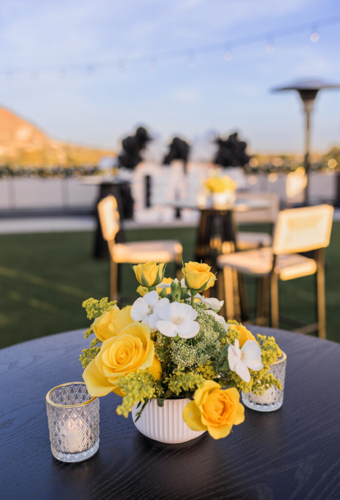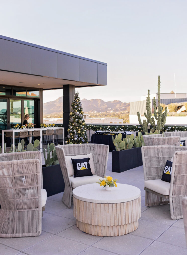 The event took place right at sunset, which made for amazing views and photo ops galore for the guests. We added in bistro lighting over the turf area to give the space a lively feel. Guests mingled in the main event space at black wood cocktail tables adorned with rattan barstools and stunning white florals with pops of that iconic Caterpillar yellow!